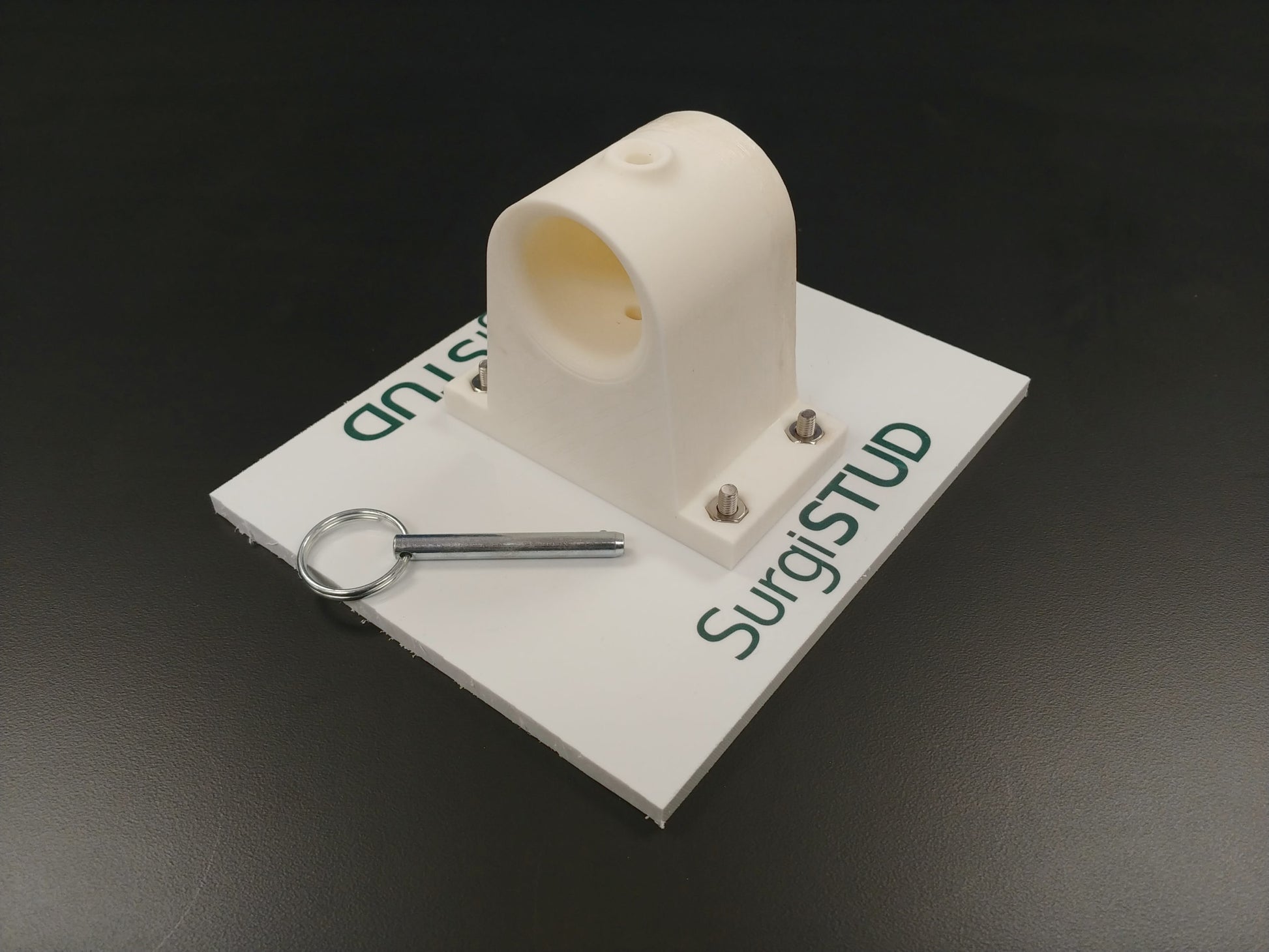 The ankle stand interfaces with all SurgiSTUD ankle models to provide a stable platform for performing total ankle arthroplasty and other ankle procedures. The stand holds the leg steady during any ankle procedures. A pin limits all motion and can be removed to allow rotation of the model for lateral imaging.