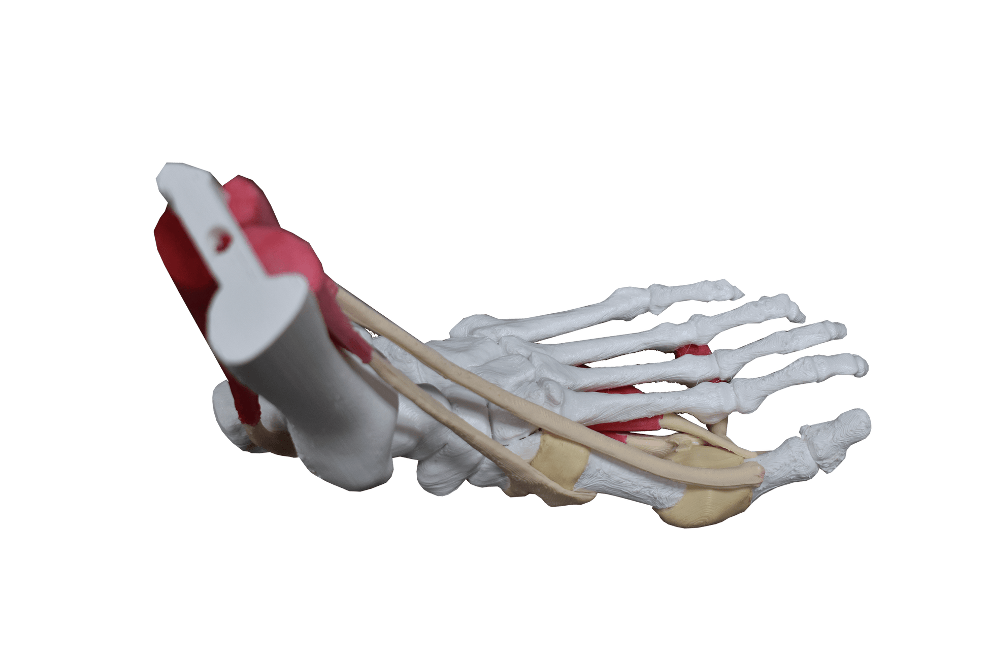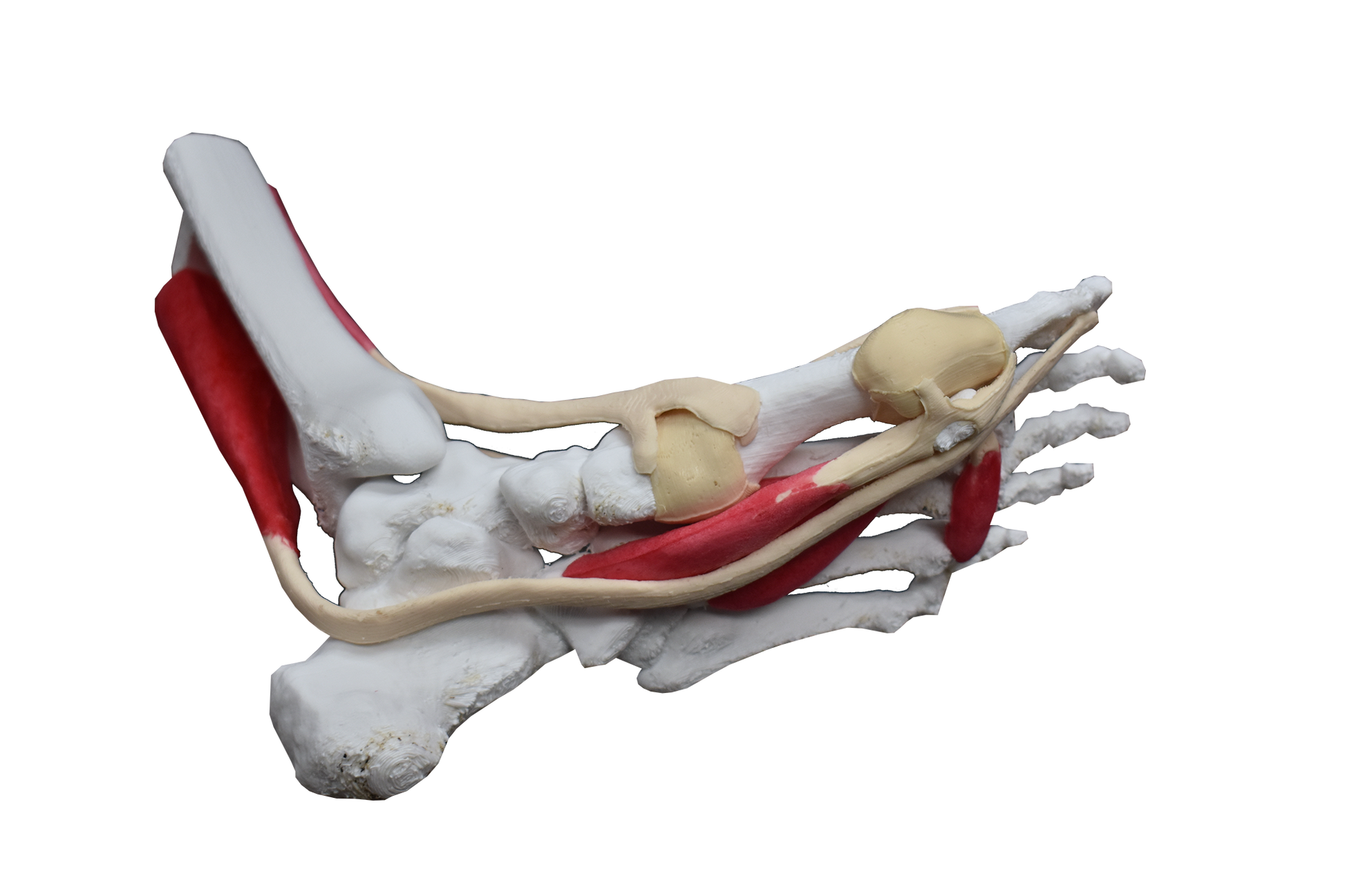 This bunion foot model includes the flexor hallucis brevis, flexor hallucis longus, extensor hallucis longus, tibialis anterior, adductor hallucis, and TMT and MTP capsules. Options to cast the model in radiolucent soft tissue or leave uncast. Additional ligament and muscles available upon request.