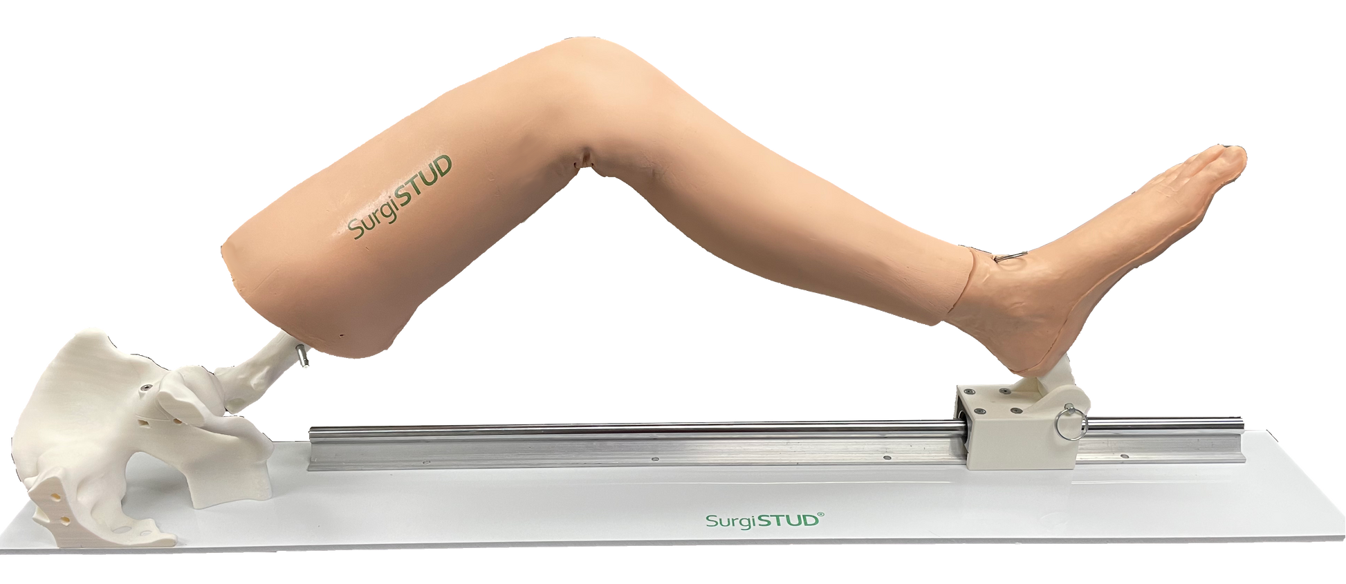 This model includes all ligaments, patella/Quads tendon w/ITB, posterior capsule and retinaculum, menisci, popliteus, quad muscles/vastus all cast within a skin and soft tissue envelope to create a realistic surgical environment.