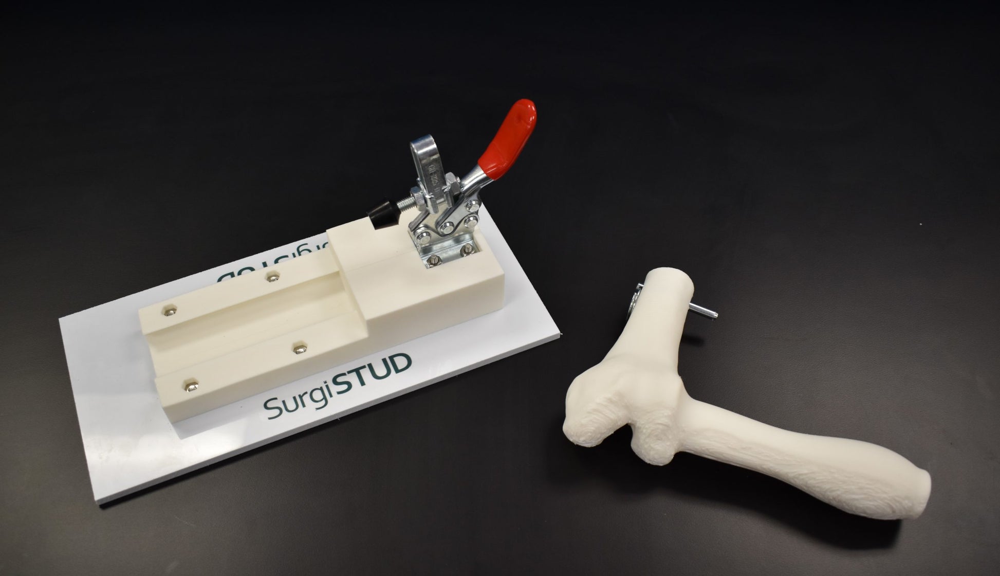 This hip stand integrates with any SurgiSTUD hip model to create a convenient and realistic environment for training hip arthroplasty procedures. The sacrum slides into the stand and the distal femur handle pins onto the proximal femur to allow for version of the femur. This stand comes with two C clamps to allow stable fixation to any table.