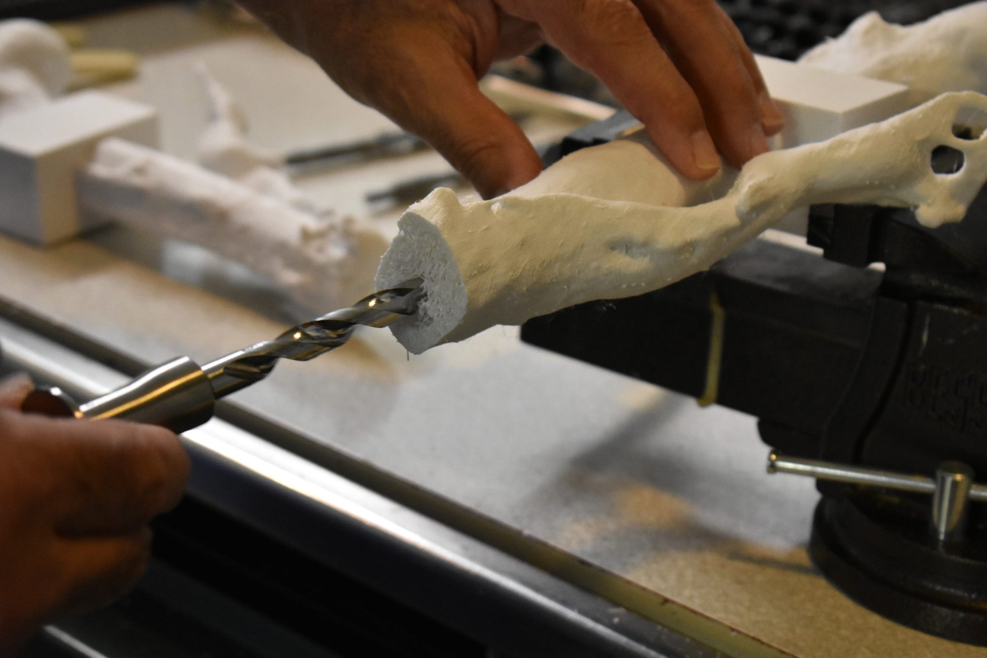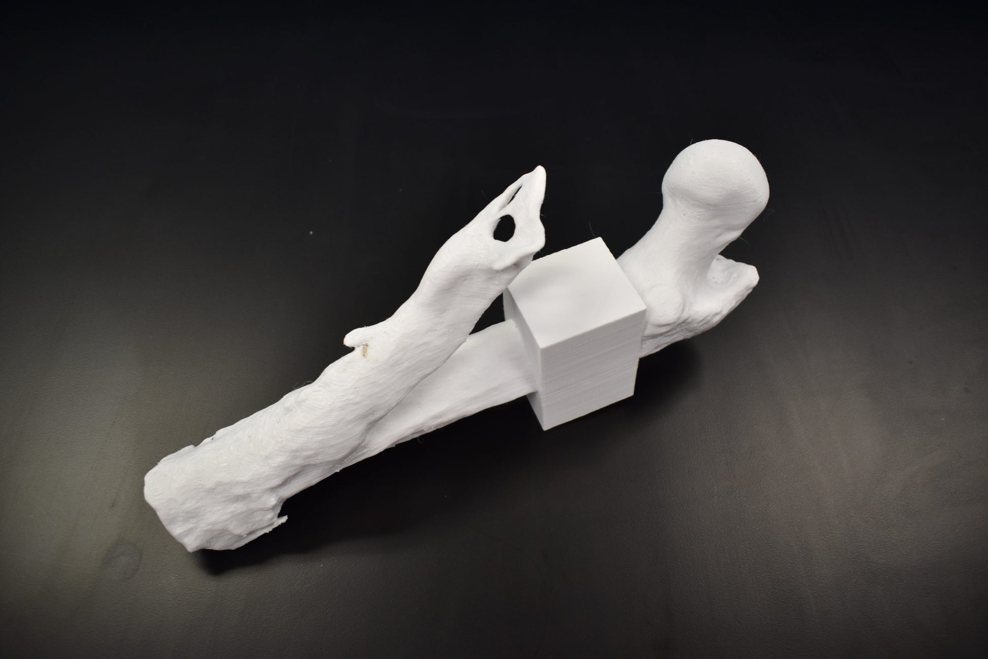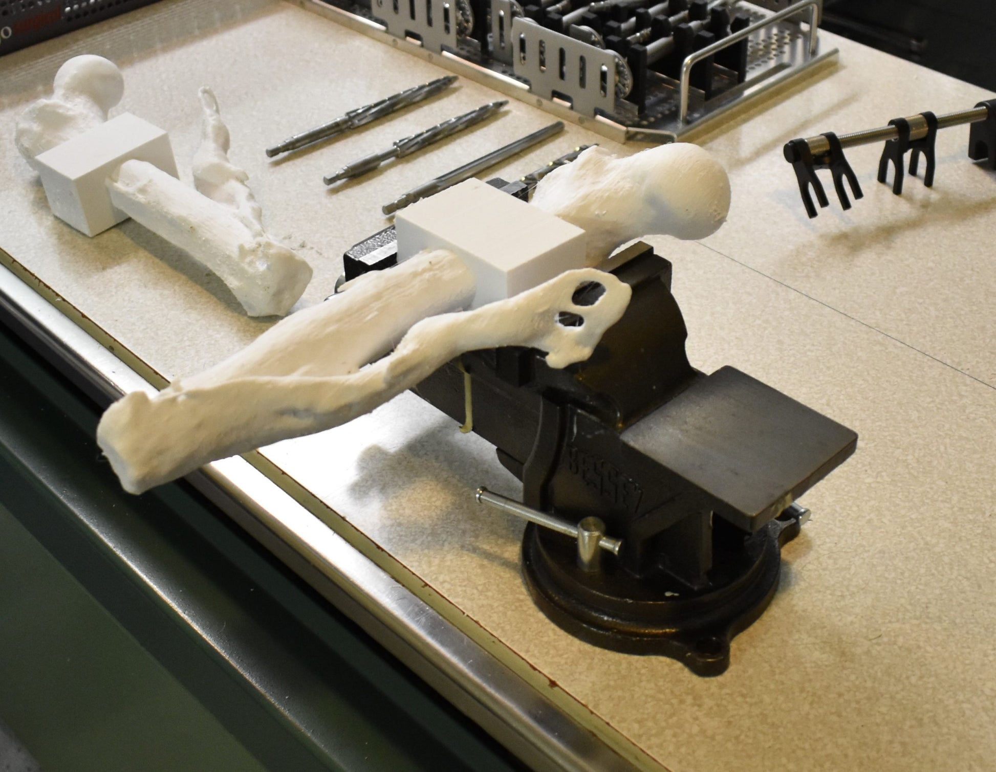 This model features bony anatomy from a patient with an above the knee amputation. This model features cortical, cancellous, intramedullary, and heterotopic regions of bone to accurately recreate the look and feel of real bone. This model features a block for model fixation in a vise. Cortical, cancellous, and IM layers of bone pass inside the block for seamless instrumentation.